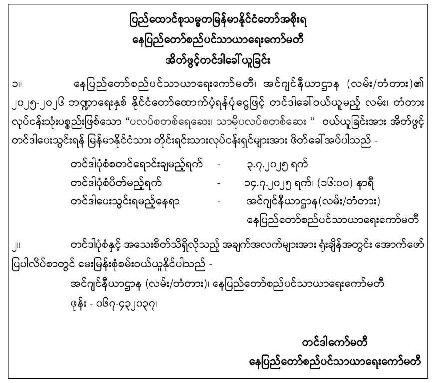 နေပြည်တော်စည်ပင်သာယာရေးကော်မတီ၊ အင်ဂျင်နီယာဌာန(လမ်း/တံတား)မှ အိတ်ဖွင့်တင်ဒါခေါ်ယူခြင်း